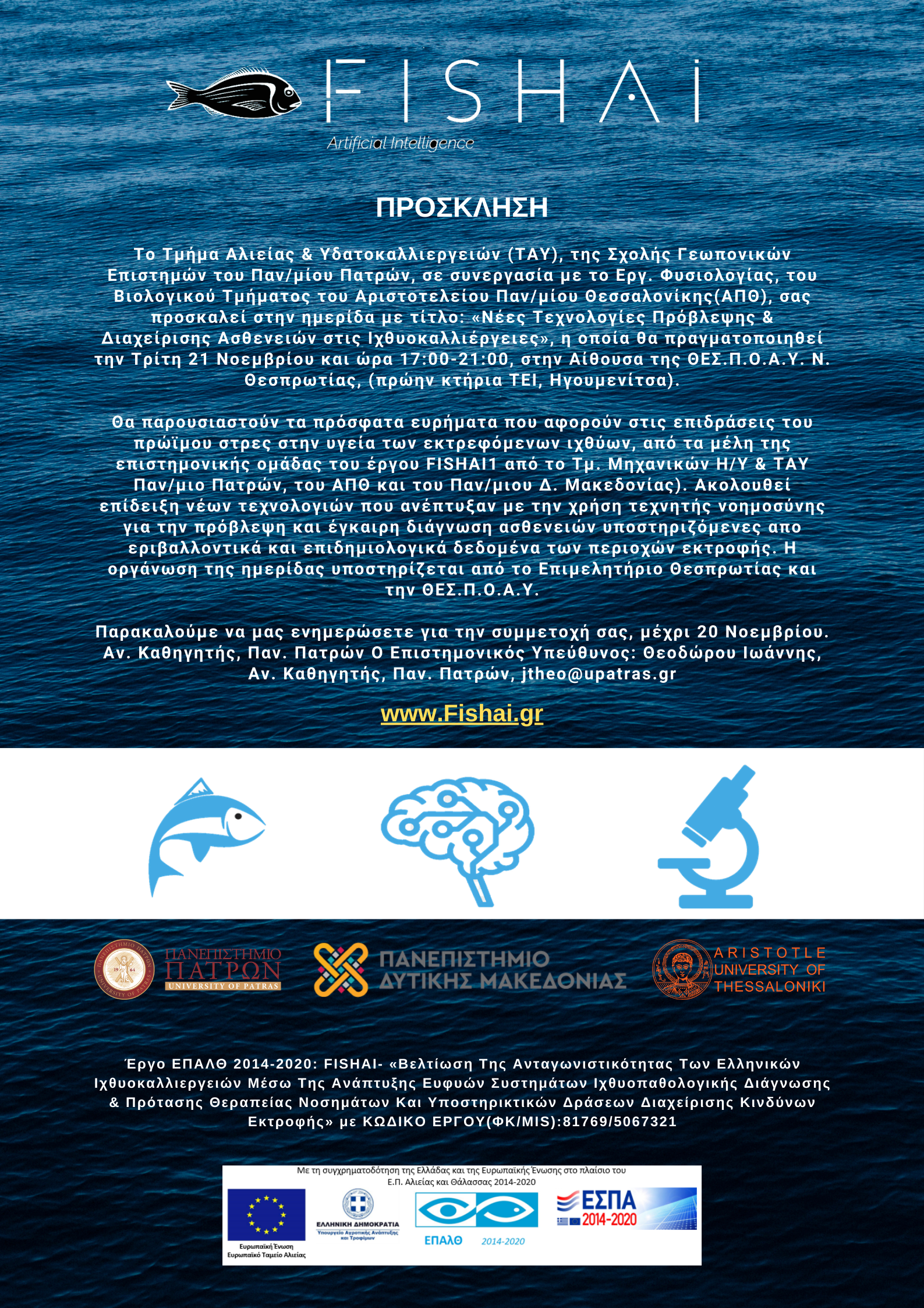 Την Τρίτη 21 Νοεμβρίου πραγματοποιήθηκε ημερδίδα με τίτλο «Νέες Τεχνολογίες Πρόβλεψης & Διαχείρισης Ασθενειών στις Ιχθυοκαλλιέργειες», από το Tμήμα Αλιείας & Υδατοκαλλιεργειών (TAY), της Σχολής Γεωπονικών Επιστημών του Πανεπιστημίου Πατρών, σε συνεργασία με το Εργ. Φυσιολογίας, του Βιολογικού Τμήματος του Αριστοτελείου Πανεπιστημίου Θεσσαλονίκης (ΑΠΘ).